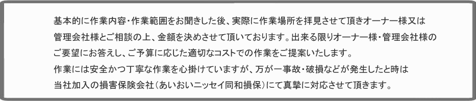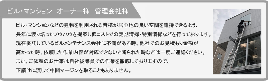 床面機械洗浄及び高圧洗浄(塩ビシート、防滑シート、磁器タイル、石材など) ガラス清掃(共用部、専有部) 照明清掃(管球交換含む)、外壁清掃など |